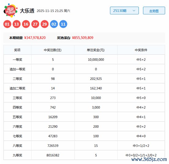 大乐透第2025130期开奖,前区:01、13、16、27、29;后区:02、11。其中前区012路比为1:3:1,奇偶比为4:1,和值为86,跨度为28,后区开出2路+2路号码。